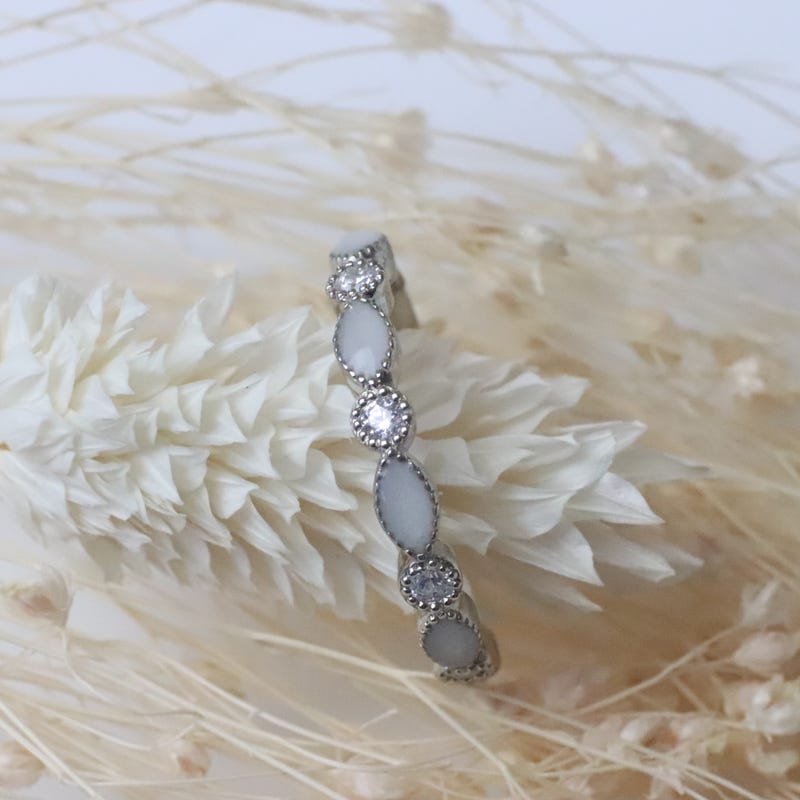 Es gibt 5 Fassungen die mit Deinem Wunschmaterial gefüllt werden und 4 weiße Zirkonia Steine.